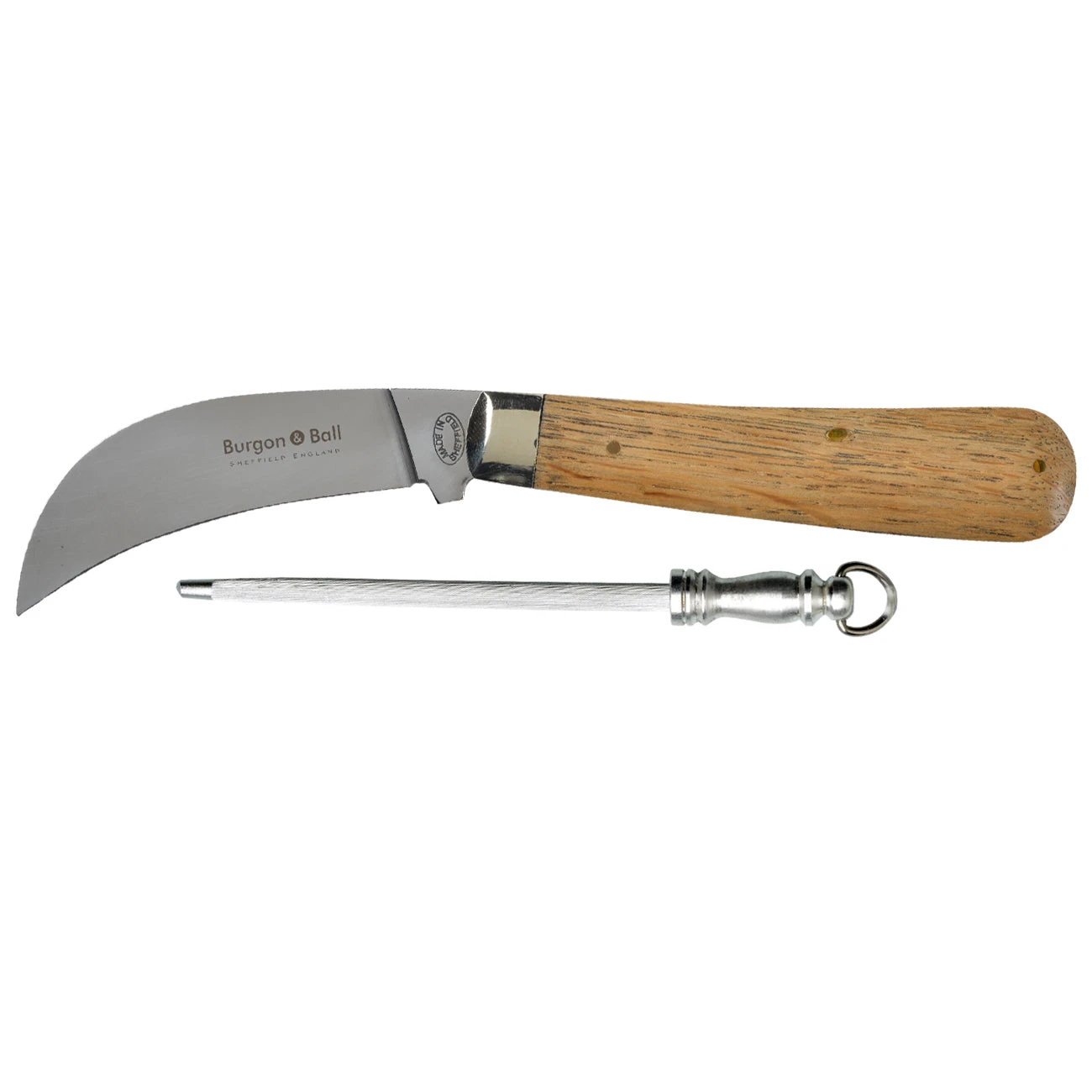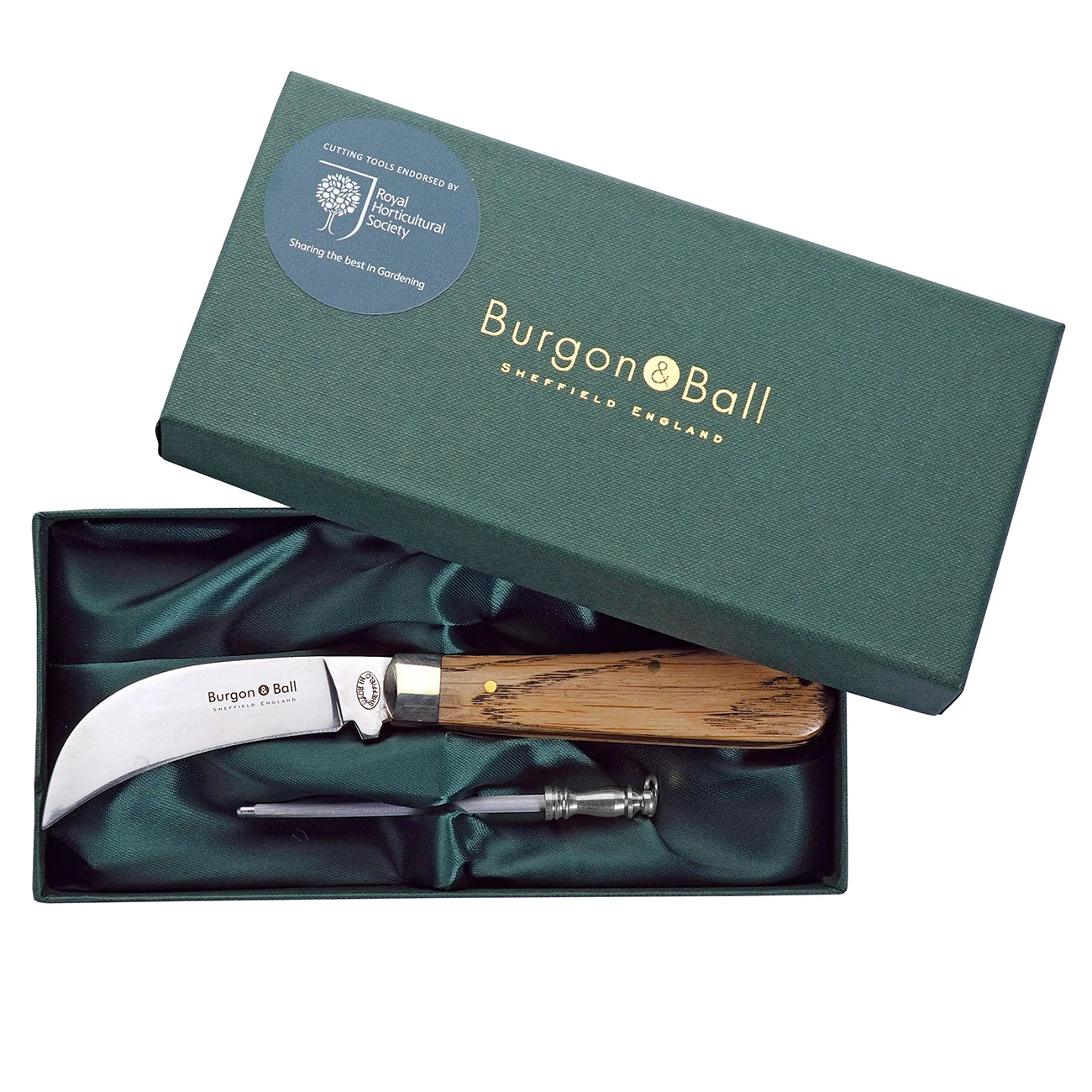 [/description][trade-description]It would be hard to find a more beautiful yet practical gift for gardeners.This is a superb quality RHS-endorsed, wooden-handled Burgon & Ball classic pruning knife and aluminium handled miniature sharpening steel in a luxurious presentation box. The traditional shaped pruning blade with pronounced hook ensures each cut is completed in one pass. The satisfyingly chunky handle suits larger hands.