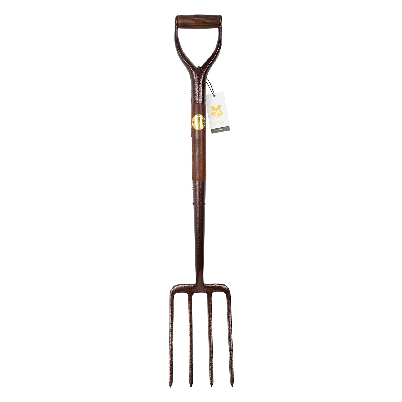 [/description][trade-description]This distinctive National Trust high-carbon steel garden fork gives a nod to the style and quality of the garden tools of yesteryear. It has been made using traditional manufacturing techniques, with an attention to design detail which delivers a digging fork of strength and durability, to make gardening easier for everyone.This garden fork has been tested to a breaking strain of 100kg, far in excess of the British standard of 55kg. The high-carbon steel tines and socket are solid forged from a single piece of metal for optimal strength, with a textured powder coating in an unusual antique bronze shade for protection from corrosion. The fork features a robust D-handle in high-carbon steel for maximum life, and the joints at socket and D-handle are double-riveted for a secure connection. The FSC® ash shaft and grip give enduring comfort, and the shaft bears a brass plaque as a hallmark of the reassurance of these two trusted names in gardening.