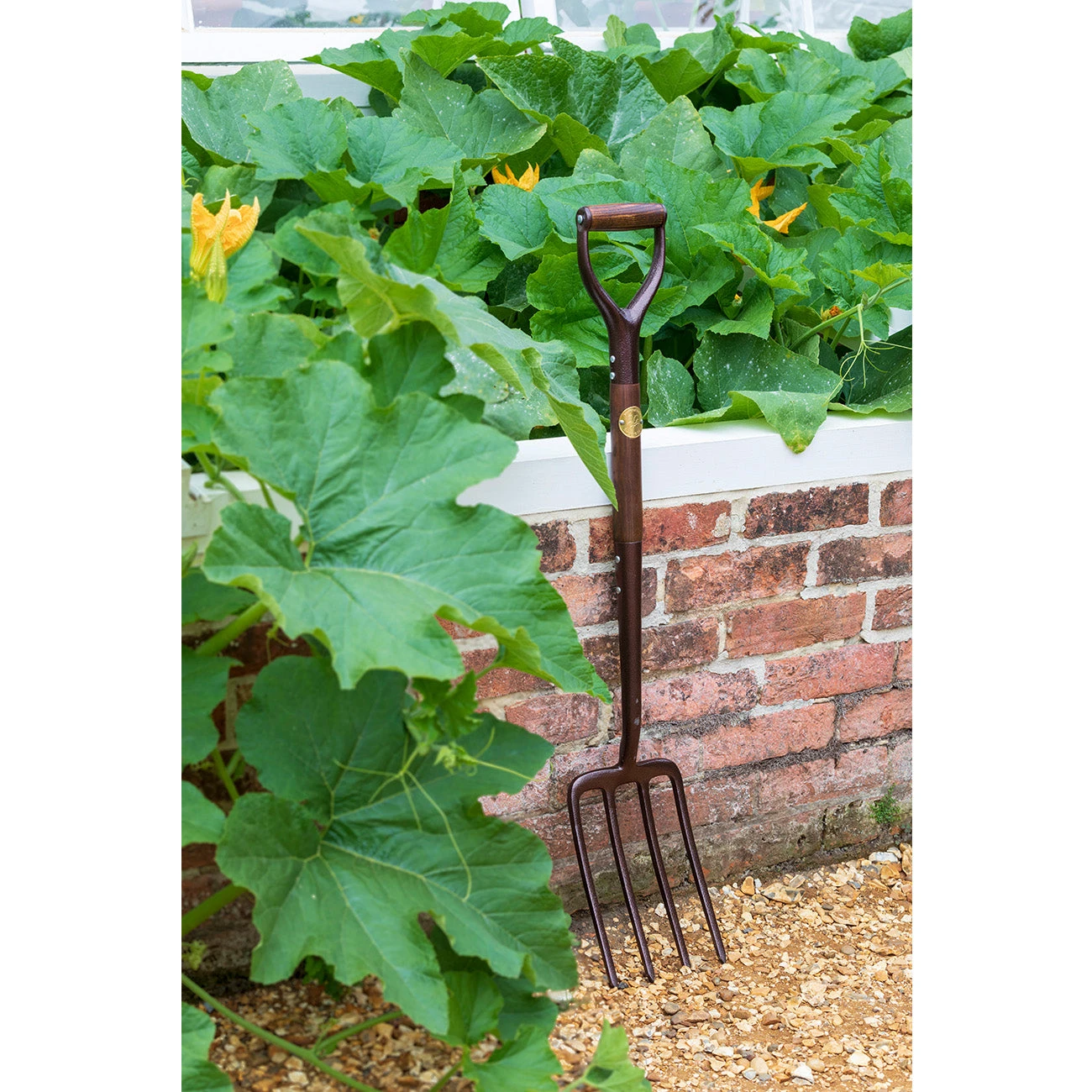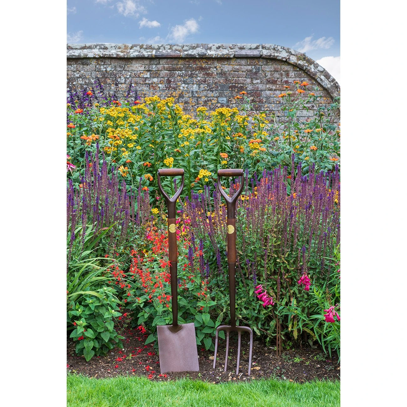 This garden fork has been tested to a breaking strain of 100kg, far in excess of the British standard of 55kg. The high-carbon steel tines and socket are solid forged from a single piece of metal for optimal strength, with a textured powder coating in an unusual antique bronze shade for protection from corrosion. The fork features a robust D-handle in high-carbon steel for maximum life, and the joints at socket and D-handle are double-riveted for a secure connection. The FSC® ash shaft and grip give enduring comfort, and the shaft bears a brass plaque as a hallmark of the reassurance of these two trusted names in gardening.