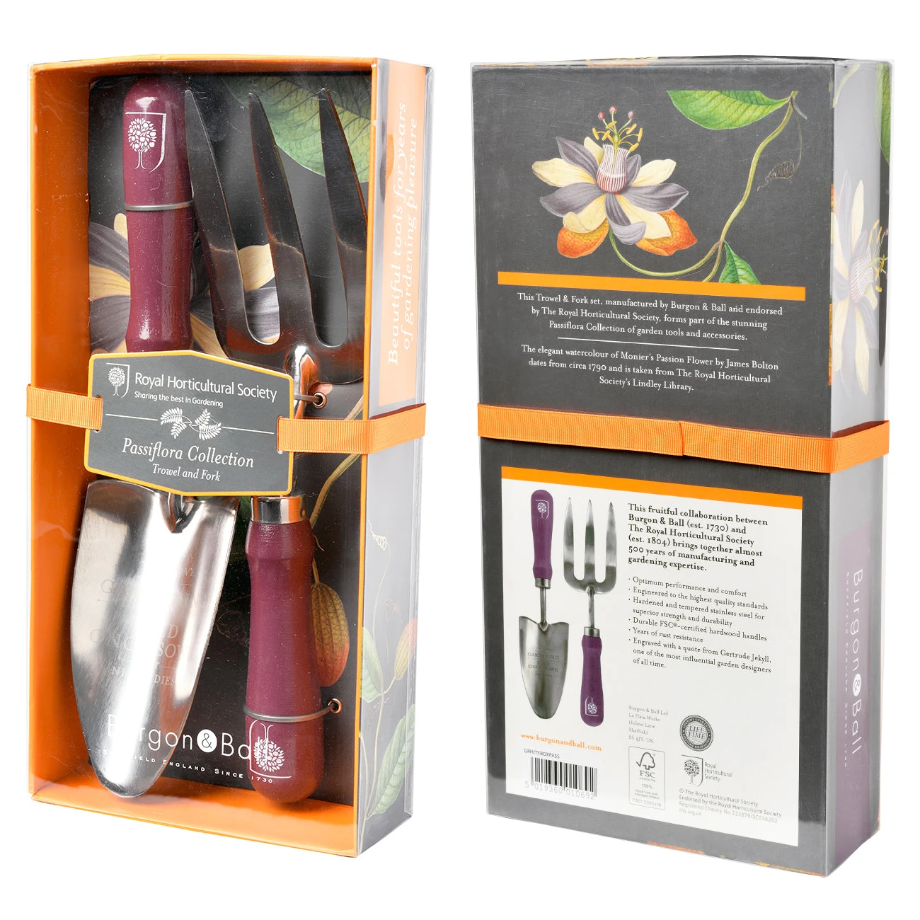 [/description][trade-description]Burgon & Ball RHS-endorsed garden trowel and garden hand fork presented in a beautiful gift box with ribbon trim. An ideal gift for a gardener – or a lovely treat for yourself!Both RHS-endorsed tools have purple painted handles and the mirror-polished stainless steel trowel head is engraved with the Gertrude Jekyll quote: “The love of gardening is a seed once sown, that never dies.” Both garden tools carry a lifetime guarantee against manufacturing defects.