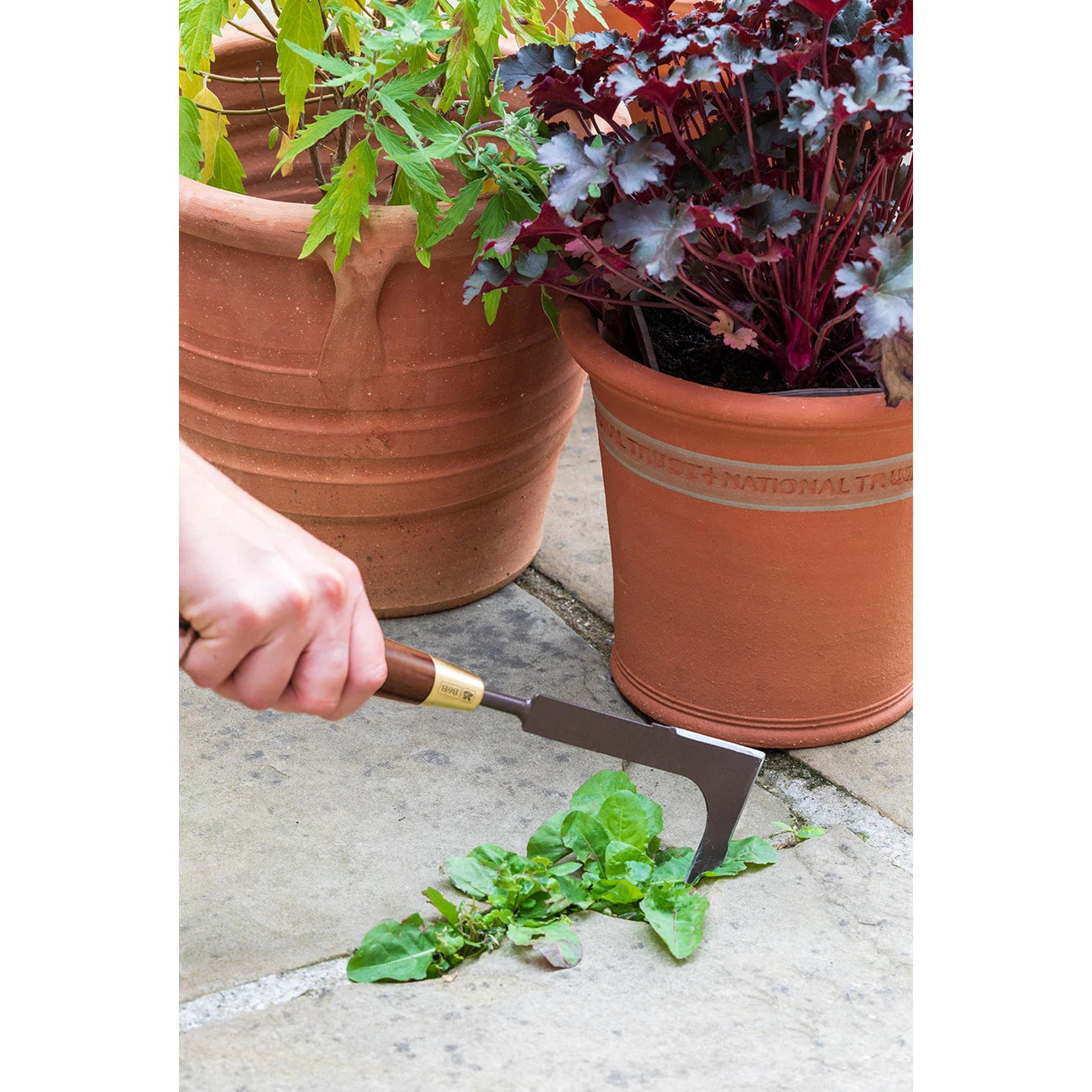 [/description][trade-description]This National Trust patio weeding knife in strong high-carbon steel echoes the style and quality of the garden tools of yesteryear. Celebrating traditional manufacturing techniques, the attention to design detail results in a garden hand tool of strength and durability, created to make gardening easier for every gardener.This weeding tool has been designed specifically to keep patios and paving looking neat and tidy. Its slimline head incorporates two sharpened blades and a fine hook, to cater for all weeding approaches! It’s ideal for excavating weeds, moss and other debris from the fine gaps between paving and from any other nooks and crannies – without using chemicals. The strong high-carbon steel body has a textured powder coating in a distinctive antique bronze colour to protect from corrosion.